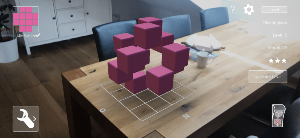 Der Augmented Reality Modus von Cube Aware bietet einen spannenden Zugang zu noch grösstenteils unerforschten Möglichkeiten räumlicher Interaktion. Augmented Reality ermöglicht die Trainierbarkeit der räumlichen Orientierung an Bildschirmen und lässt Schülerinnen und Schüler physisch um das Würfelbauwerk herumgehen.
